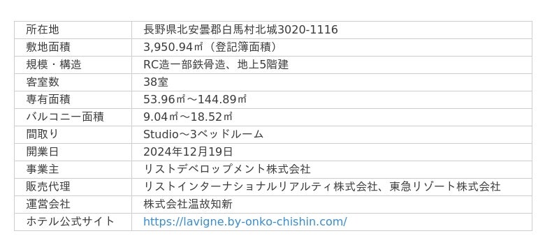 総合不動産企業のリスト株式会社(代表取締役社長:北見尚之、本社所在地:神奈川県横浜市)の連結子会社であるリストデベロップメント株式会社(代表取締役社長:木内寛之、本社所在地:神奈川県横浜市、以下「LD」)が開発し、リストインターナショナルリアルティ株式会社(代表取締役社長:北見尚之、本社所在地:神奈川県横浜市、仲介ブランド:「リスト サザビーズ インターナショナル リアルティ」、以下「LIR」)と、東急リゾート株式会社(代表取締役社長:磯目伸二、本社所在地:東京都渋谷区)が販売していたホテルコンドミニアム「ラ ヴィーニュ 白馬 by 温故知新」(所在地:長野県北安曇郡白馬村、以下「本物件」)は、2025年5月30日をもって全戸完売したことをお知らせします。
