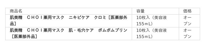 「肌美精CHOI」は、10代~20代の肌悩みに寄り添う2ラインが揃った薬用シリーズで、ニキビ&肌・毛穴を普段のお手入れでチョイッと手軽にケアができます。今回「薬用マスク ニキビケア」と「薬用マスク 肌・毛穴ケア」の2種で「クロミ」と「ポムポムプリン」の限定デザインパッケージが実現しました。