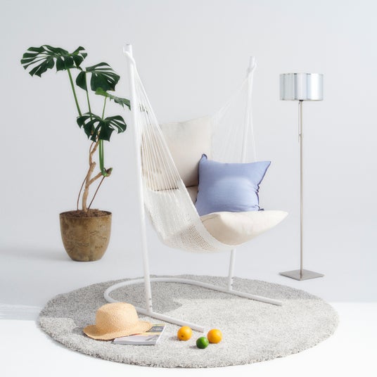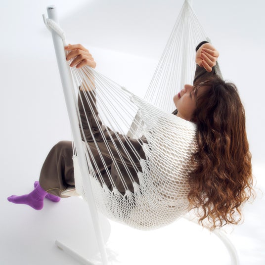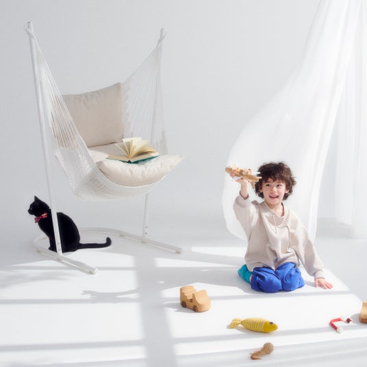 つつまれ、浮かぶ。心地よい揺れと、溶けるような肌ざわり。大好きな家族との、新しい団欒のカタチ。インテリアにも溶け込みながらも存在感のある美しいフォルムを実現したハンモックチェア