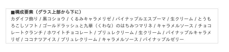 グラスの中部から下部にかけては、パイナップルキャラメリゼやココナツアイス、パイナップルゼリーが層を成し、夏らしいトロピカルな味わいをお楽しみいただけます。