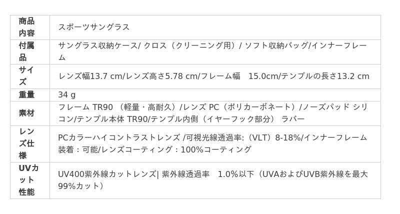 36gの超軽量TR90フレームに、耐衝撃性の高いポリカーボネート(PC)レンズを組み合わせ、
