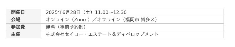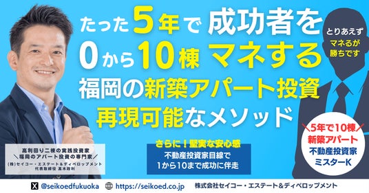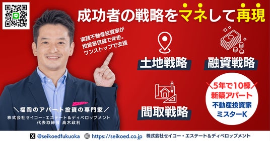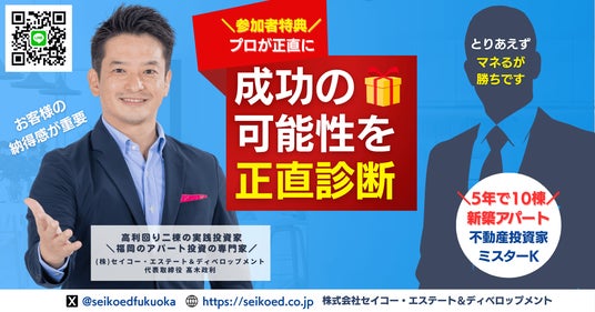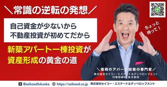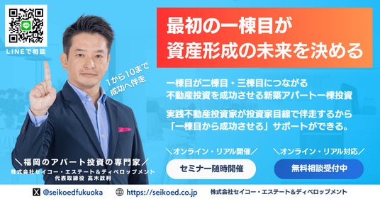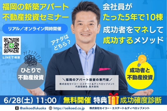 株式会社セイコー・エステート&ディベロップメント(本社:福岡市、代表取締役:高木政利)は、2025年6月28日(土)、福岡とオンラインにて「再現可能な新築アパート一棟不動産投資セミナー」を開催いたします。