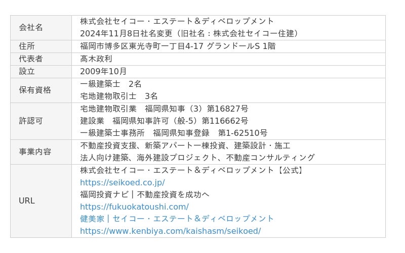 株式会社セイコー・エステート&ディベロップメントは、土地選定・融資設計・建築設計・運用管理までを一気通貫で支援する福岡の不動産投資支援企業です。