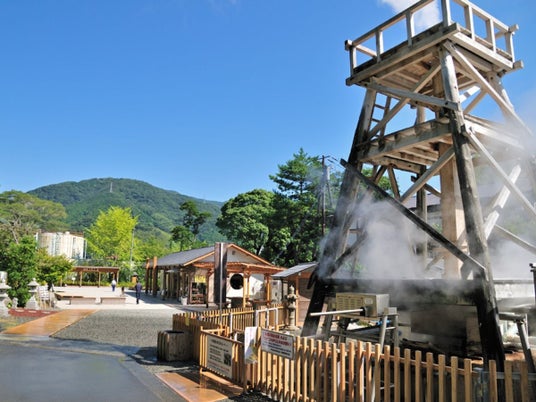 峰温泉大噴湯公園高さ30m超の温泉噴き上げは圧巻。自然のエネルギーを体感。温泉で大噴湯たまごを作りや、足湯が楽しめます。