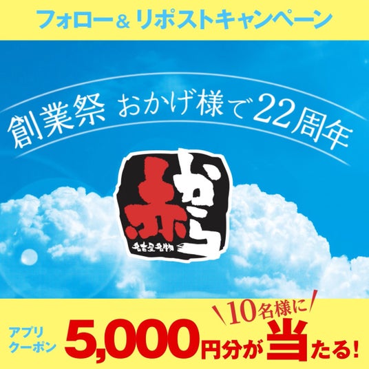 赤から公式Xアカウントをフォローして「赤から創業祭」の投稿をリポストすると、抽選で10名様に「5,000円OFFのクーポン」が当たります。1日1回挑戦できるので、ぜひ応募してください。
