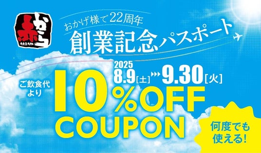 あわせて期間中に来店されたお客様には8月9日(土)から9月30日(火)まで何度でも飲食代が10%OFFになる「創業記念パスポート」をプレゼント。