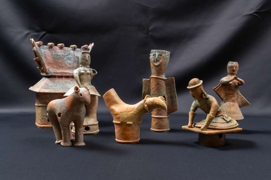 百足塚古墳で発見された形象埴輪は、ほぼ同時期に造られ継体天皇陵と目されている大阪府今城塚古墳で発見された形象埴輪の種類や内容が近く、政権の中枢を担った大王の埴輪祭祀が導入されたものと推測されます。