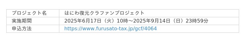 本プロジェクトは、2025年6月17日(火)10時~2025年9月14日(日)23時59分までの期間中、トラストバンク社(URL:https://www.furusato-tax.jp/gcf/4064)にて実施されます。
