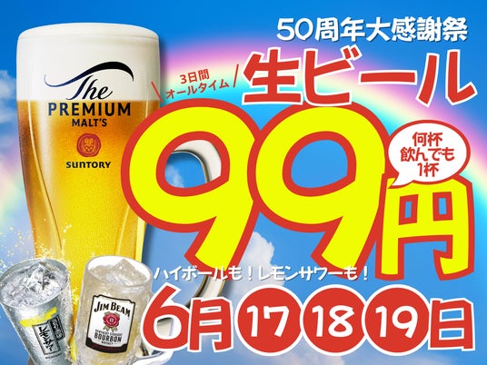 梅雨の合間の晴れ間が心地よいこの季節、「居酒屋一休」では、6月17日(火)~19日(木)の3日間限定で「生ビール99円祭り」を開催いたします!