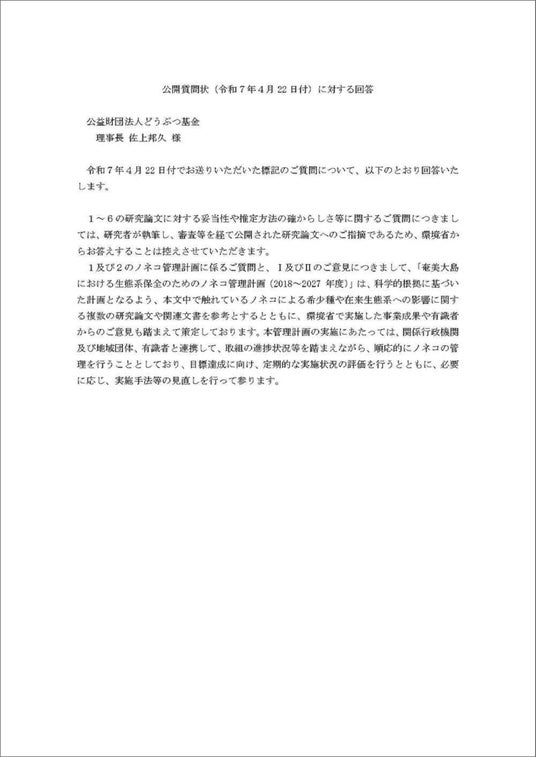 2025年4月22日、公益財団法人どうぶつ基金(所在地:兵庫県芦屋市、理事長:佐上邦久)は、環境省が進める「奄美大島におけるノネコ管理計画」に関して、環境大臣宛てに科学的根拠の正当性を問う公開質問状を提出していました。