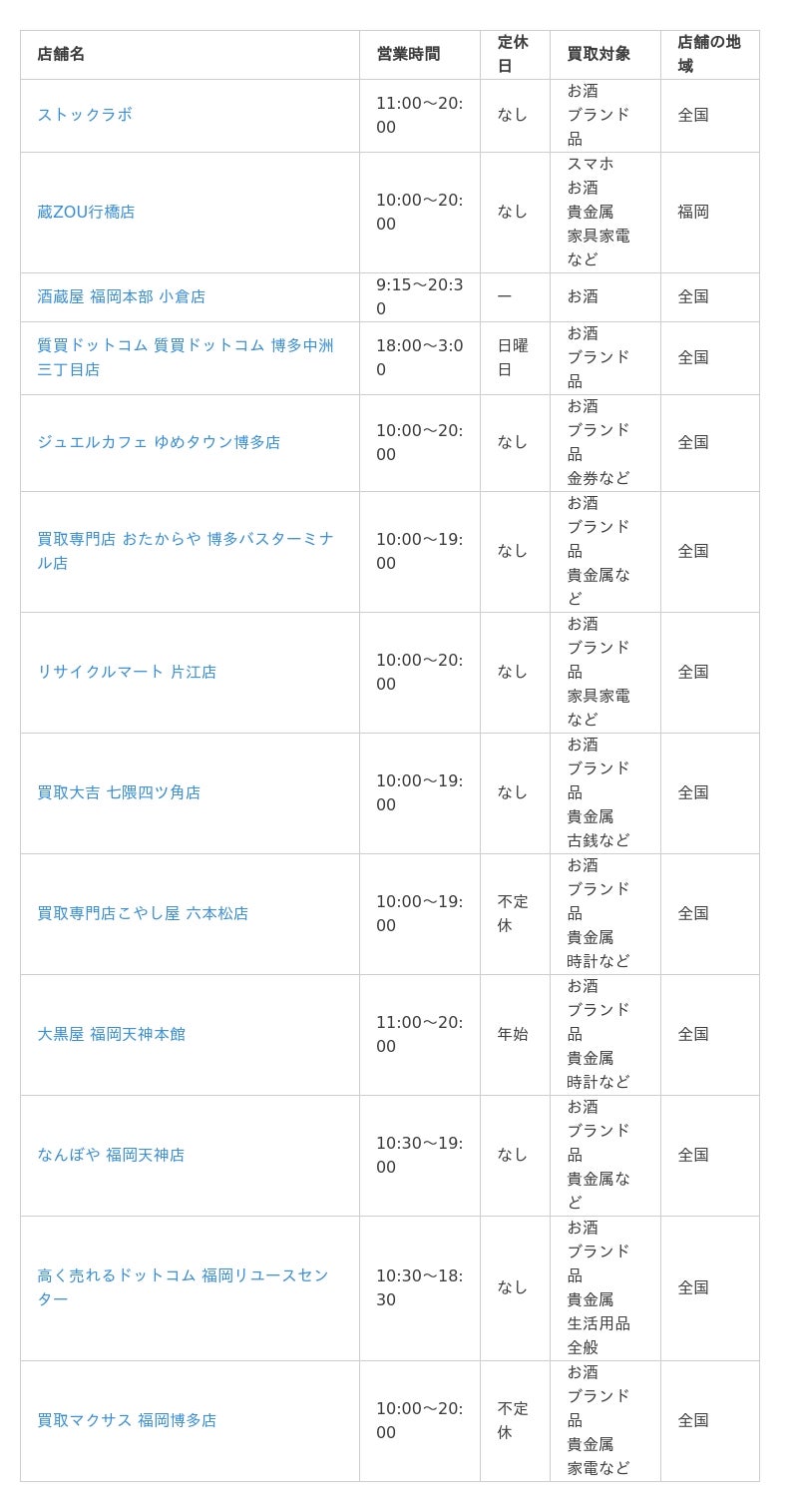 それでは、福岡県でおすすめのお酒買取サービスをランキング形式でご紹介しましょう。まずは、各店舗の営業時間や定休日、買取対象などをまとめた一覧表からご覧ください。