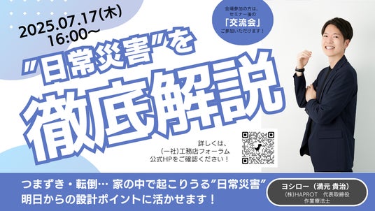 2025年7月17日(木)開催「“日常災害”を徹底解説」セミナー告知ビジュアル。つまずき・転倒など身近な災害を防ぐ住まいの設計ポイントを紹介します。