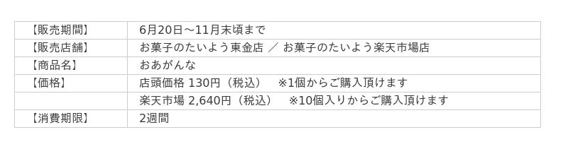 株式会社太陽社(所在地:千葉県匝瑳市飯倉293、代表取締役:片岡正裕)が展開する千葉県で長年愛される菓子店「お菓子のたいよう」は、東金店限定・洋風もっちりチーズケーキまんじゅう『おあがんな』を、今年も6月20日より販売いたします。