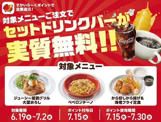 対象メニューをご注文いただいたお客さまを対象に、一緒にご注文いただいたセットドリンクバー価格相当のすかいらーくポイントを進呈するオトクなキャンペーンを開催いたします。