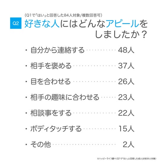 本気で好きな人ができたことがあると答えた成人女性84人を対象に、「本気で好きな人にどんなアピールをしましたか?」とアンケートを取りました。