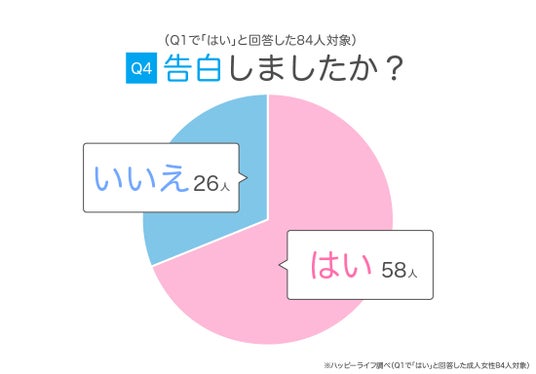 アンケートの結果、「本気で好きな人ができたことがある」と答えた成人女性84人のうち、約3割の女性が「好きな人に告白できていない」と回答しました。