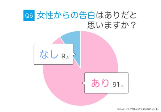 ハッピーライフでは、成人男性100人を対象に「女性からの告白はありだと思いますか?」とアンケートを取りました。