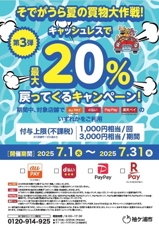 市では物価高騰の影響を受けている生活者の負担を緩和するとともに中小企業等の経営を支援するため、国の物価高騰対応重点支援地方創生臨時交付金を活用し、キャッシュレス決済でのお支払い額を対象に、ポイントを最大20%還元するキャンペーンを実施します。