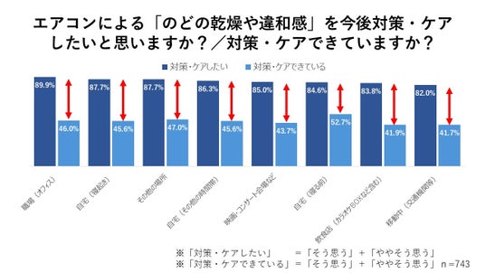 エアコンによる「のどの乾燥・違和感」に対する対策・ケアができていない人は約半数にのぼりました。一方で、今後の対策意向については、いずれのシーンにおいても8割以上が「対策・ケアをしたい」と回答しており、実施状況と意向の間にギャップがみられました。