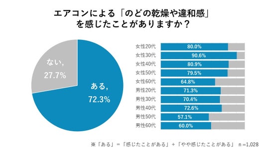 – エアコン使用中に「のどの乾燥や違和感」を感じたことがある人は72.3%。
