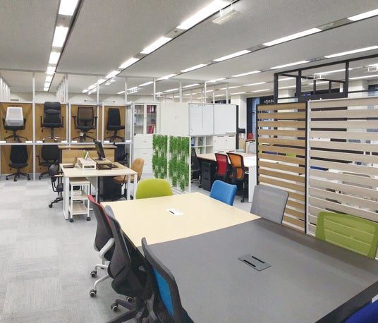 ショールームには、オフィス空間に欠かせないスチールデスクやチェア、パーテーション、書庫、フリーアドレス用テーブル、国産木製オフィス家具など、常時100アイテム以上を展示しております。