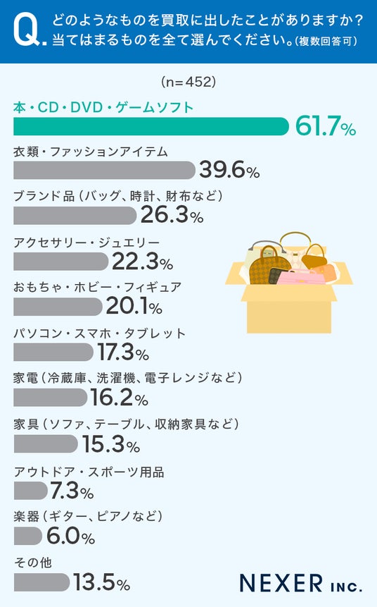 61.7%と半数以上の方が「本・CD・DVD・ゲームソフト」を買取に出したことがある、と回答しています。