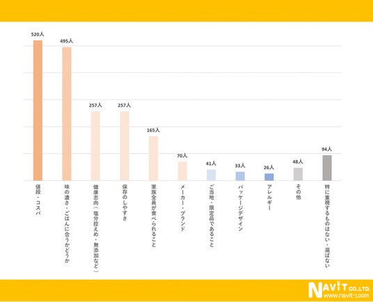 ご飯のお供を選ぶ基準についてのアンケートです。一番多かったのは「値段・コスパ」で520人、次に多かったのは「味の濃さ・ご飯に合うかどうか」で495人、3番目は「健康志向(塩分控えめ・無添加など)」と「保存のしやすさ」が同数で257人という結果になりました。
