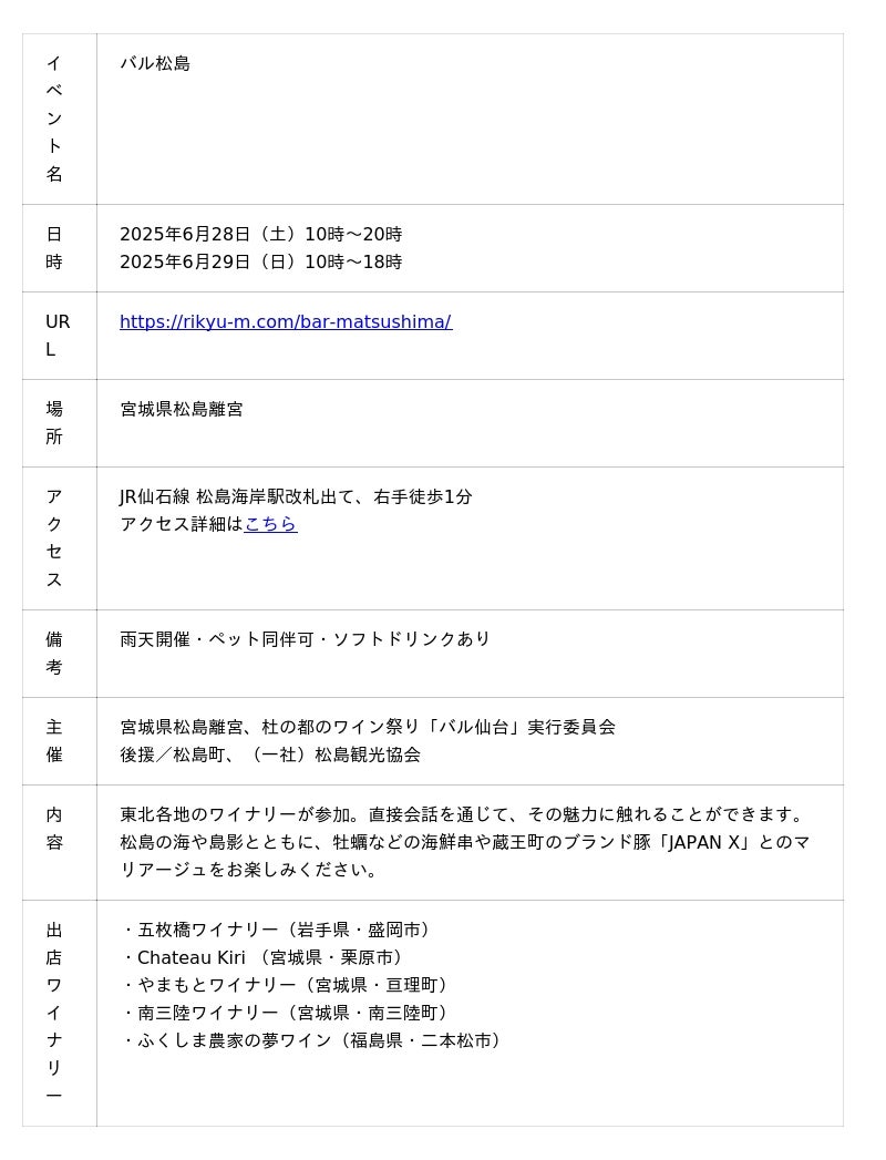 宮城県松島離宮では、東北各地のワインの魅力をお伝えする新たなイベントとして、「バル松島」を初開催いたします。