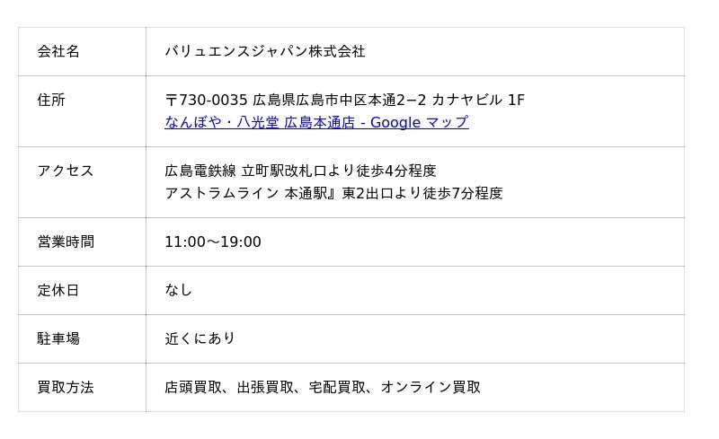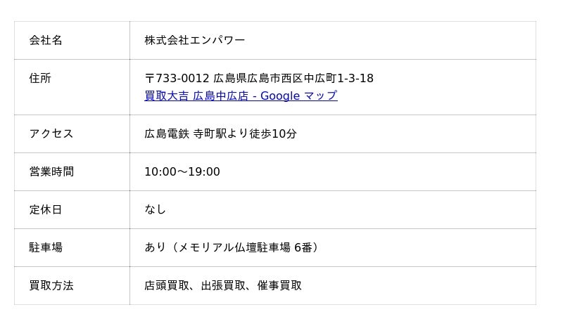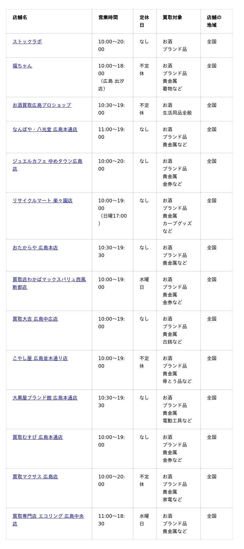 ではさっそく、広島でおすすめのお酒買取業者を9選ご紹介しましょう。初めに、今回業界する業者、および業者の営業時間や買取品目などをまとめた一覧表から見てください。