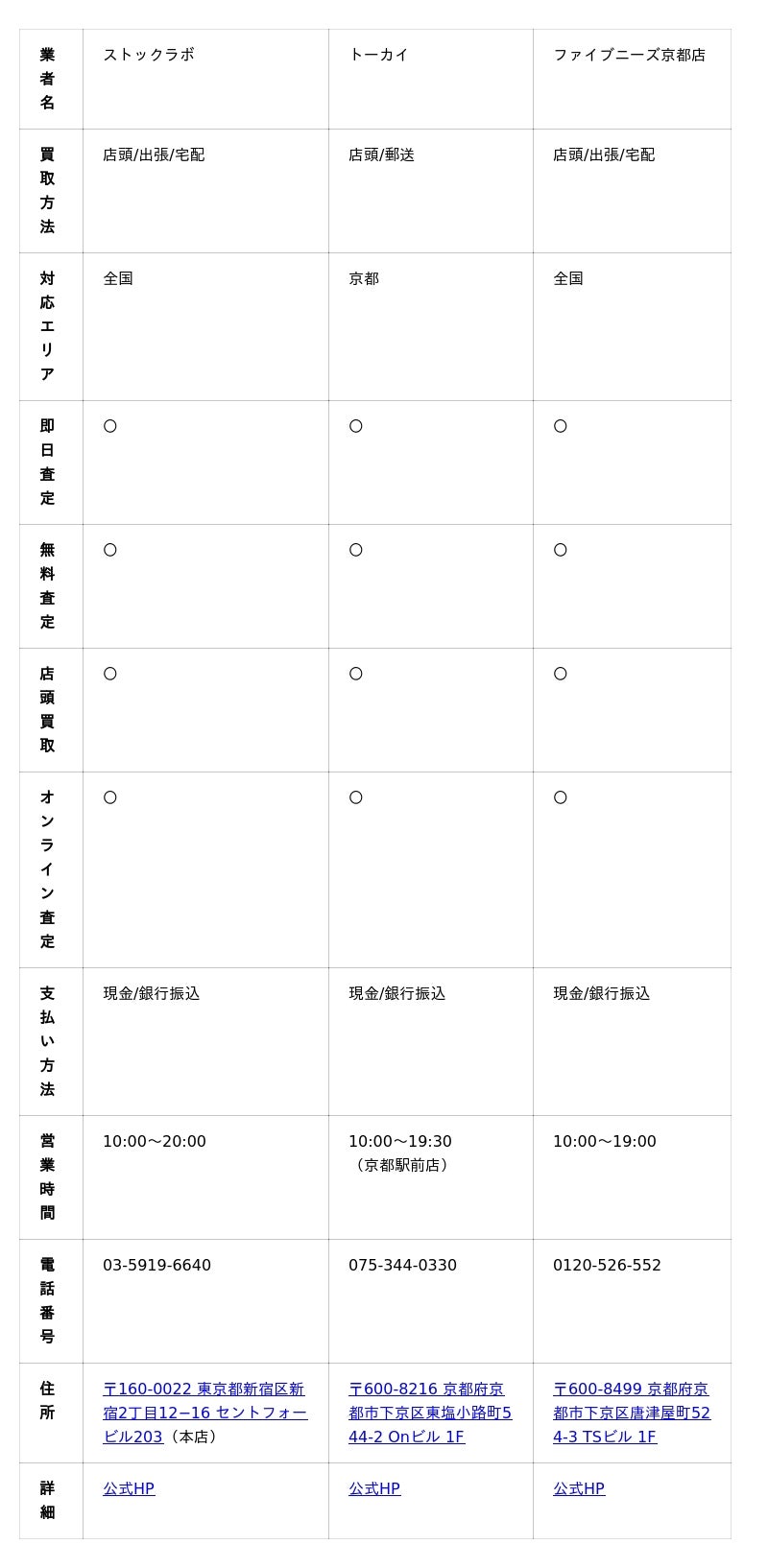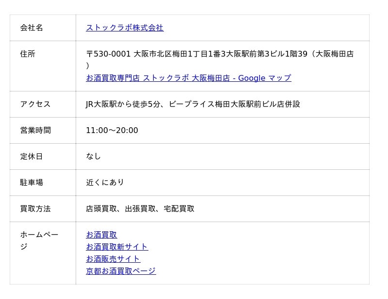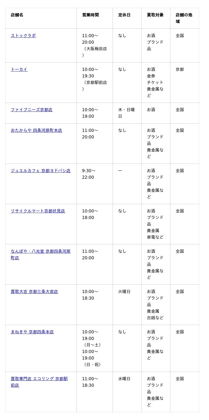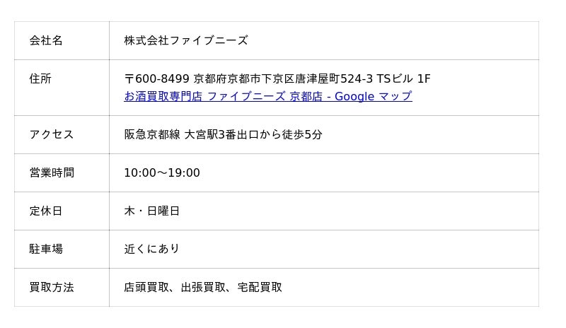 では、京都でおすすめのお酒買取業者を9選ご紹介しましょう。まずは、今回紹介する業者と基本情報をまとめた一覧表からご確認ください。