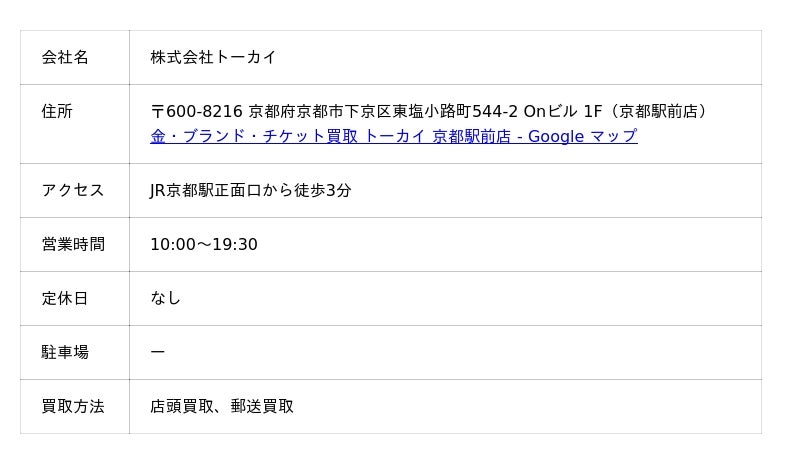 トーカイは、京都に12店舗を展開、年間買取実績15万件を誇ります。チケットや金券を中心に、ブランド品、貴金属、お酒などを取り扱い、買取以外に外貨両替にも対応。店頭買取、郵送買取に対応し、買取以外に外貨両替も行っています。