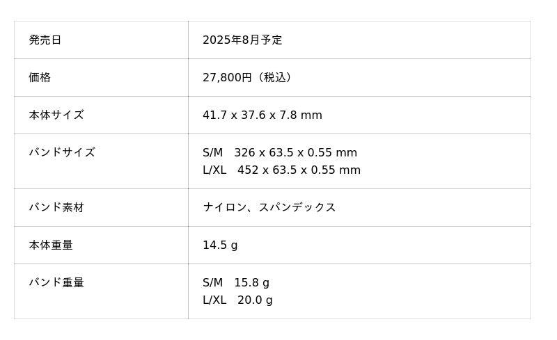 ・バンド素材は、装着時の快適性とフィット感を第一に考え、ナイロンとスパンデックスを採用。 伸縮性と柔らかな肌触り、優れた通気性、そしてしわになりにくいのが特徴です。