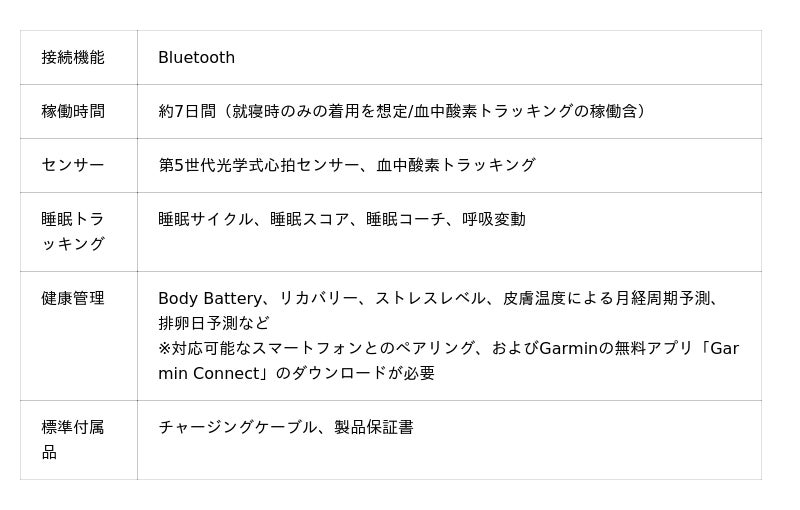 ・ウェアラブルウォッチと併用することにより、日中のトレーニングや活動からのリカバリー状況を示す「リカバリータイム」をはじめ、「トレーニングレディネス」や「トレーニングステータス」などリカバリーの指標やアドバイスを「Garmin Connect」アプリを介して提供。