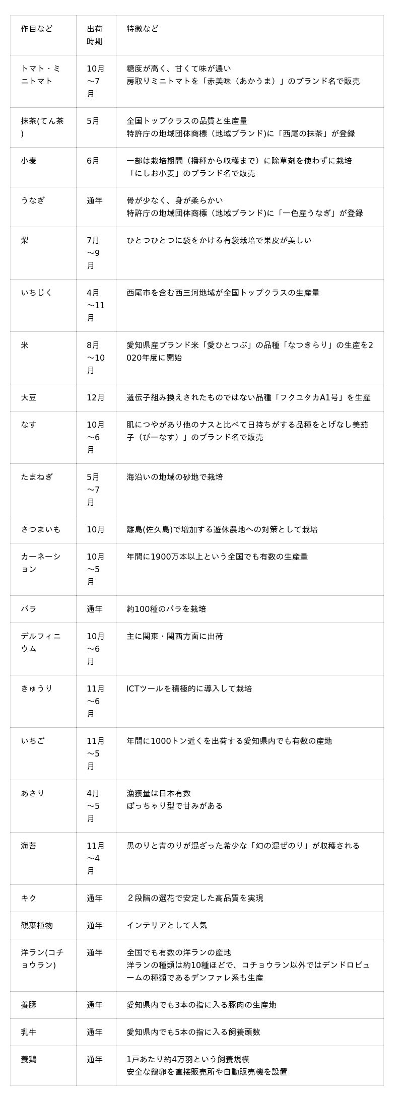 抹茶やうなぎ以外にも、西尾市ではさまざまな農畜水産物が生産・水揚げされています。