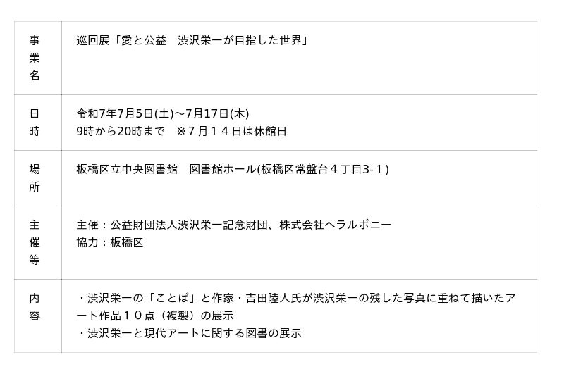 板橋区立中央図書館の図書館ホール(板橋区常盤台4丁目3-1)において、令和7年7月5日(土)から7月17日(木)まで、巡回展「愛と公益 渋沢栄一が目指した世界」が開催されます。