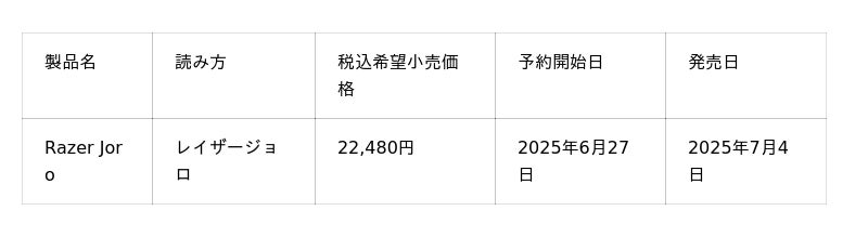 ゲーマー向けライフスタイルブランドとして世界をリードするRazer(TM)(本社:米国カリフォルニア州およびシンガポール、共同創業者兼CEO:Min-LiangTan)は、モバイルゲーミングキーボードの新基準となる「Razer Joro」を発表しました。2025年6月27日(金)より予約開始いたします。販売開始は2025年7月4日(金)を予定しています。