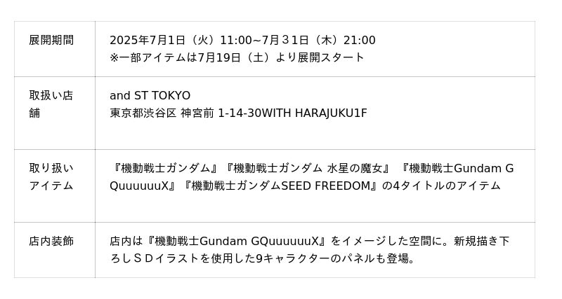 アダストリアグループでモール&メディア事業やプロデュース事業を展開する株式会社アンドエスティ(東京都渋谷区渋谷2-21-1、代表取締役社長CEO:木村 治)は、2025年7月1日より株式会社バンダイ(東京都台東区駒形1-4-8、代表取締役社長CEO:竹中 一博)の『機動戦士ガンダム』『機動戦士ガンダム 水星の魔女』 『機動戦士Gundam GQuuuuuuX』『機動戦士ガンダムSEED FREEDOM』の4タイトルのガンダムシリーズ商品のポップアップスペースをand ST TOKYOにて展開いたします。ここでしか手に入らない限定アイテムを含む100種類を超えるラインアップと、描き下ろしイラストを使用した全11種の数量限定ステッカーをノベルティとしてプレゼントいたします。