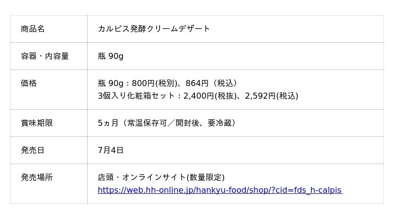 アサヒ飲料株式会社(本社 東京、社長 米女太一)は、株式会社阪急阪神百貨店(本社 大阪、社長 山口俊比古)が運営する阪急うめだ本店(大阪府大阪市)に、2022年4月から展開している「カルピス」ブランドのコンセプトショップ『発酵「CALPIS」PARLOR』で『カルピス発酵クリームデザート』を7月4日から販売します。
