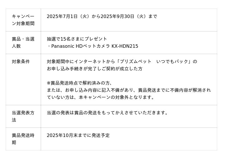 対象期間中にインターネットから「プリズムペット いつでもパック」にご契約いただいたお客さまの中から抽選で合計15名さまに「Panasonic HDペットカメラ KX-HDN215」が当たります。