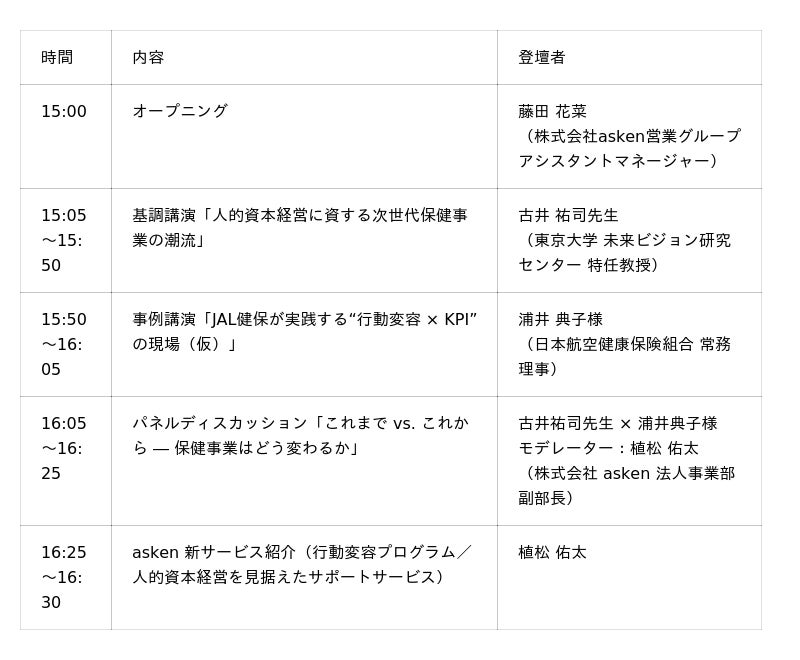 また、新サービスの本格始動を記念して、健康保険組合や企業の人事・健康経営推進ご担当者様向けに、無料セミナー【保健事業の「今」と「これから」~人的資本経営に基づいた次世代型保健事業とは~】(以下「本セミナー」)を2025年8月1日(金)15:00~16:30にハイブリッド形式(オフライン+オンライン)で開催します。