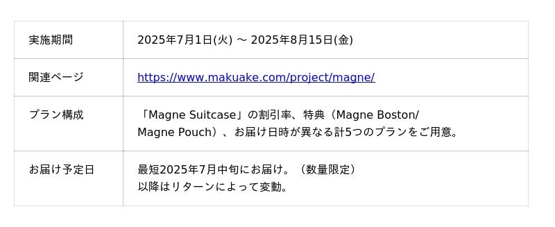 旅行ジャパン株式会社 (本社:東京都渋谷区、代表取締役CEO:猿渡歩) は、「強さと軽さ」をテーマにした旅行ブランド『Magne (マグネ) 』を発表。第1弾となる新製品として、世界で初めてボディ全面にマグネシウム合金を採用した金属製スーツケース「Magne Suitcase」を、2025年7月1日(⽕)~8月15日(金)の期間限定で、株式会社マクアケ (所在地:東京都渋谷区、代表取締役社長:中山 亮太郎) が展開する日本最大級の応援購入サービス「Makuake」において、先行販売致します。