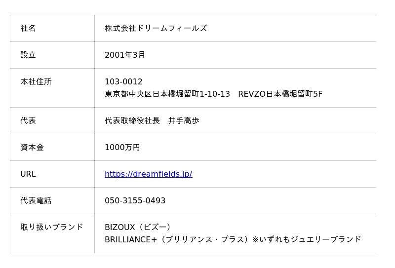 「BIZOUX(ビズー)」を運営する(株)ドリームフィールズは、皮革製品を製造販売する(株)土屋鞄製造所と同様、(株)ハリズリーのグループ会社です。「ビズー」は当社が展開するカラーストーンを使ったジュエリーブランドで、20~40代の女性に支持されています。東京をはじめ大都市に10店の常設直営店を構えます。