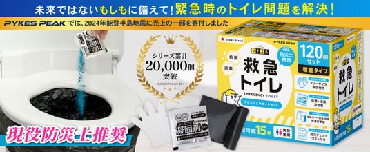 災害時の断水・停電に備える簡易トイレ。使い切り型で衛生的に処理ができ、20回・60回・120回などのサイズ展開や子ども用の小型サイズも用意されています。長期保存にも対応。