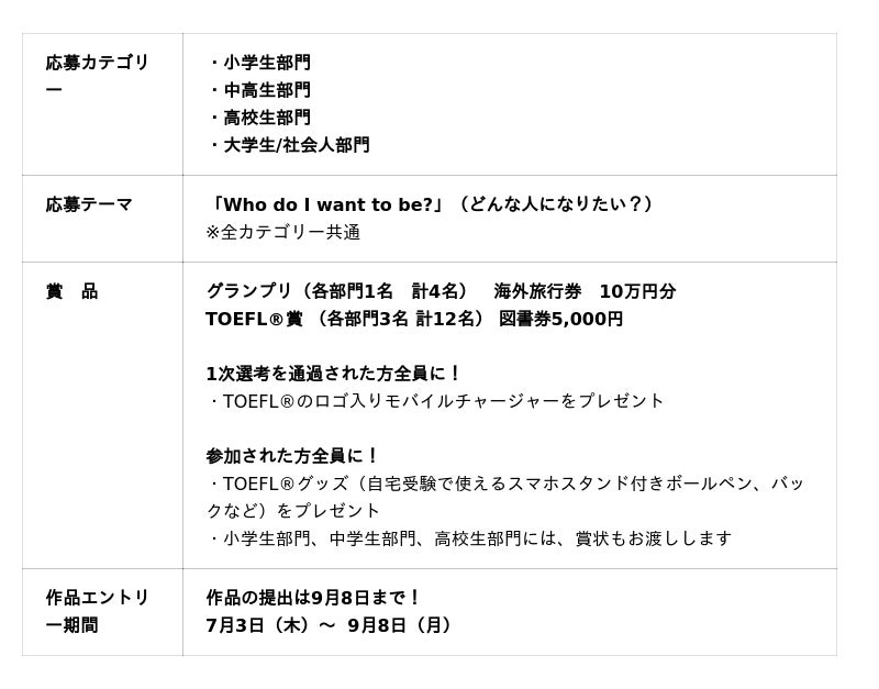 詳しくは「2025 #TOEFL(R)の日 Speakingチャレンジ動画コンテスト」スペシャルサイト をご確認ください。