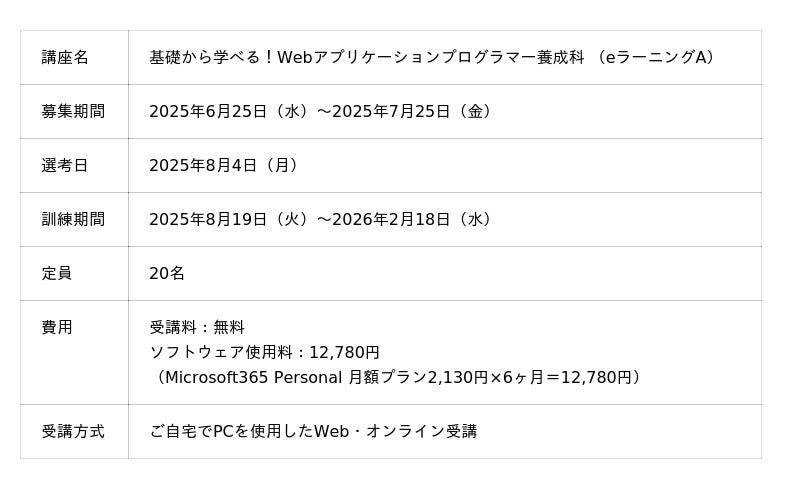 Webアプリケーションプログラマー養成科は、プログラミングとWebアプリケーションの制作スキルを身に着け、業務効率化の提案・設計・実装ができる人材を目指す職業訓練コースです。本コースでは、以下の内容を学ぶことができます。