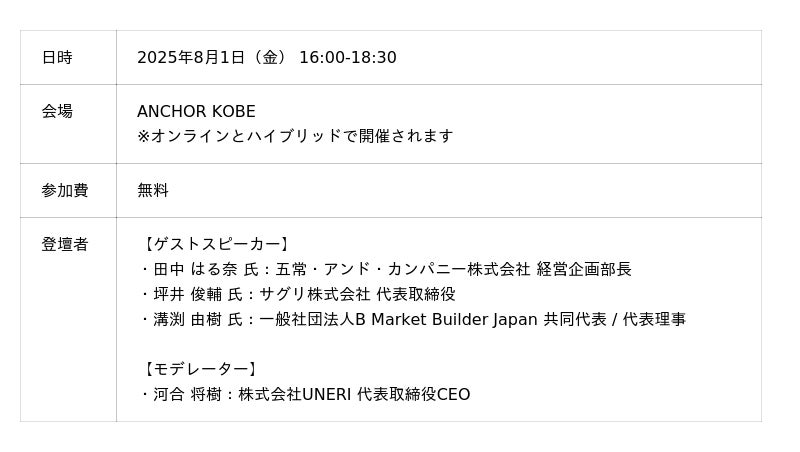 8/1(金)開催のキックオフイベントには サグリCEO 坪井俊輔氏、五常アンドカンパニー田中はる奈氏、B Market BuilderJapan代表 溝渕由樹氏、UNERI代表河合将樹が登壇