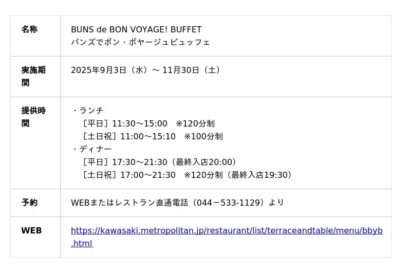 ホテルメトロポリタン 川崎(運営/日本ホテル株式会社、総支配人/金田 文典)の直営するオールデイダイニング「Terrace and Table」では、ホテル開業5周年を記念したビュッフェの第二弾として、2025年9月3日(水)~11月30日(日)の期間、ビュッフェの楽しさの原点に立ち返り、好きな料理を自由に組み合わせて心行くまで楽しめる「BUNS de BON VOYAGE! BUFFET(バンズでボン・ボヤージュビュッフェ)」を開催いたします。