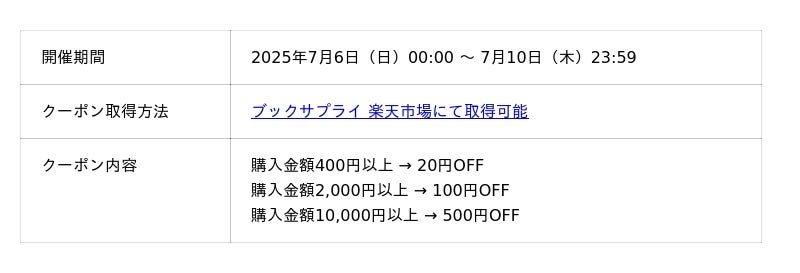 キャンペーン期間は2025年7月6日(日)0:00から7月10日(木)23:59まで。期間中、ブックサプライ楽天市場店にて、書籍やメディアのお買い物に使える最大500円OFFクーポンをはじめ、超おトクなクーポンを多数配布します。