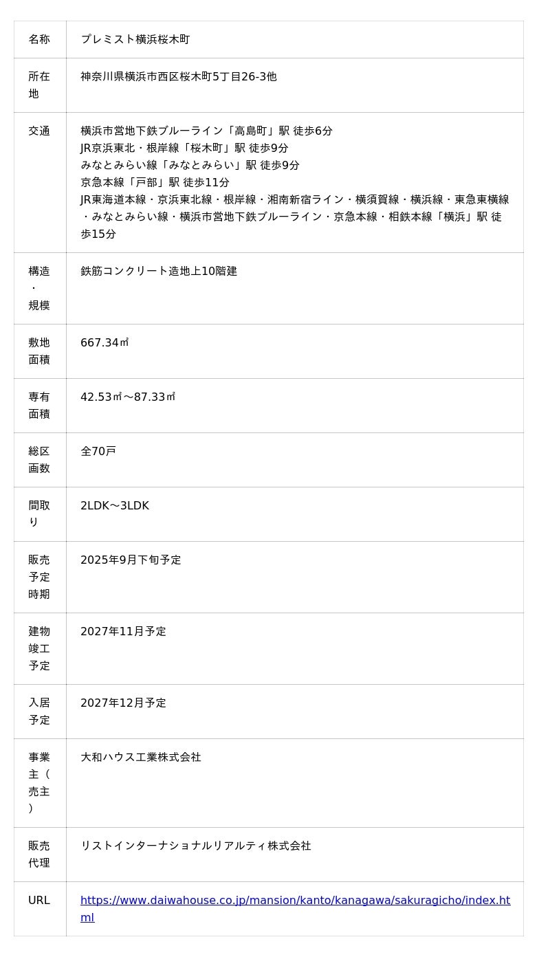 総合不動産企業、リスト株式会社(代表取締役社長:北見尚之、本社所在地:神奈川県横浜市)の連結子会社であるリストインターナショナルリアルティ株式会社(代表取締役社長:北見尚之、本社所在地:神奈川県横浜市、以下「LIR」)は、大和ハウス工業株式会社 (代表取締役社長:大友浩嗣、本社所在地:大阪府大阪市)が売主である新築分譲マンション「プレミスト横浜桜木町(以下、本物件)」の販売代理を受託しました。物件情報のご提供が可能となる物件エントリーは、2025年5月20日より受付開始しております。また、物件案内会は2025年7月5日、販売開始は2025年9月下旬ごろを予定しています。