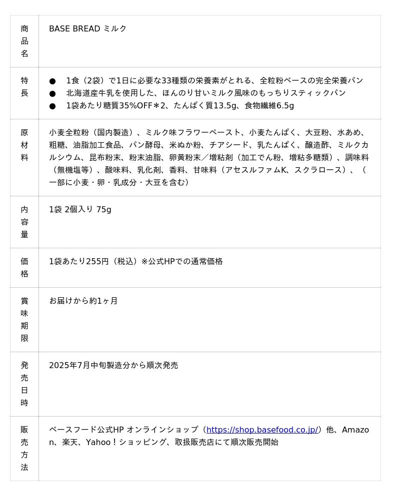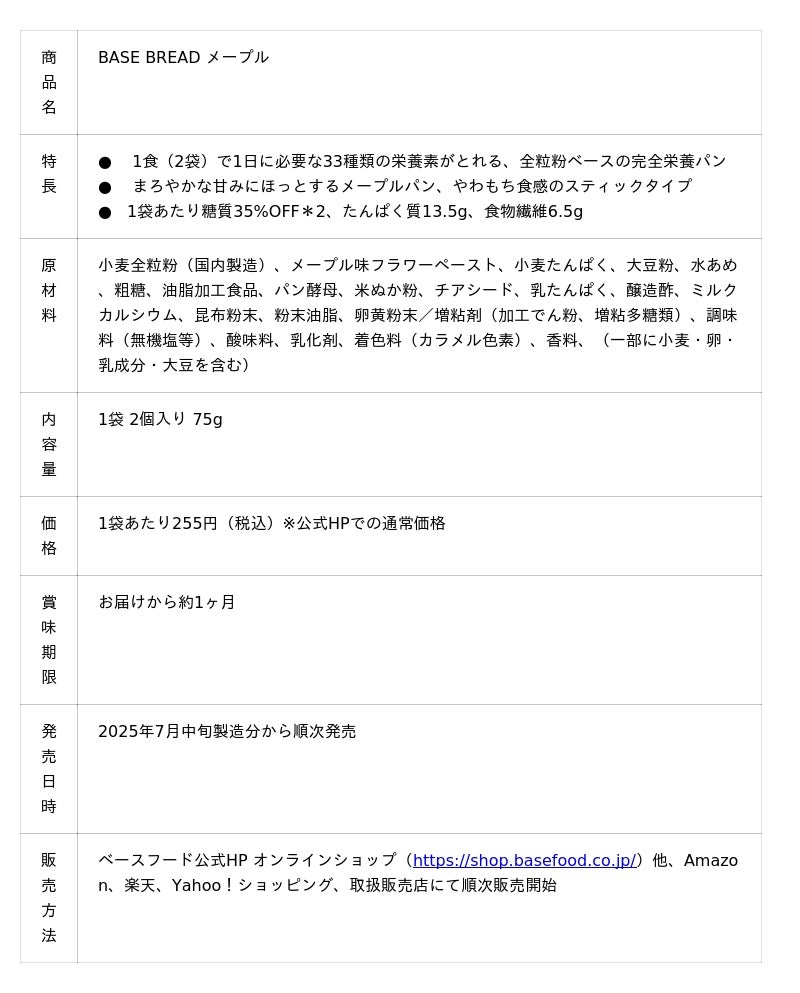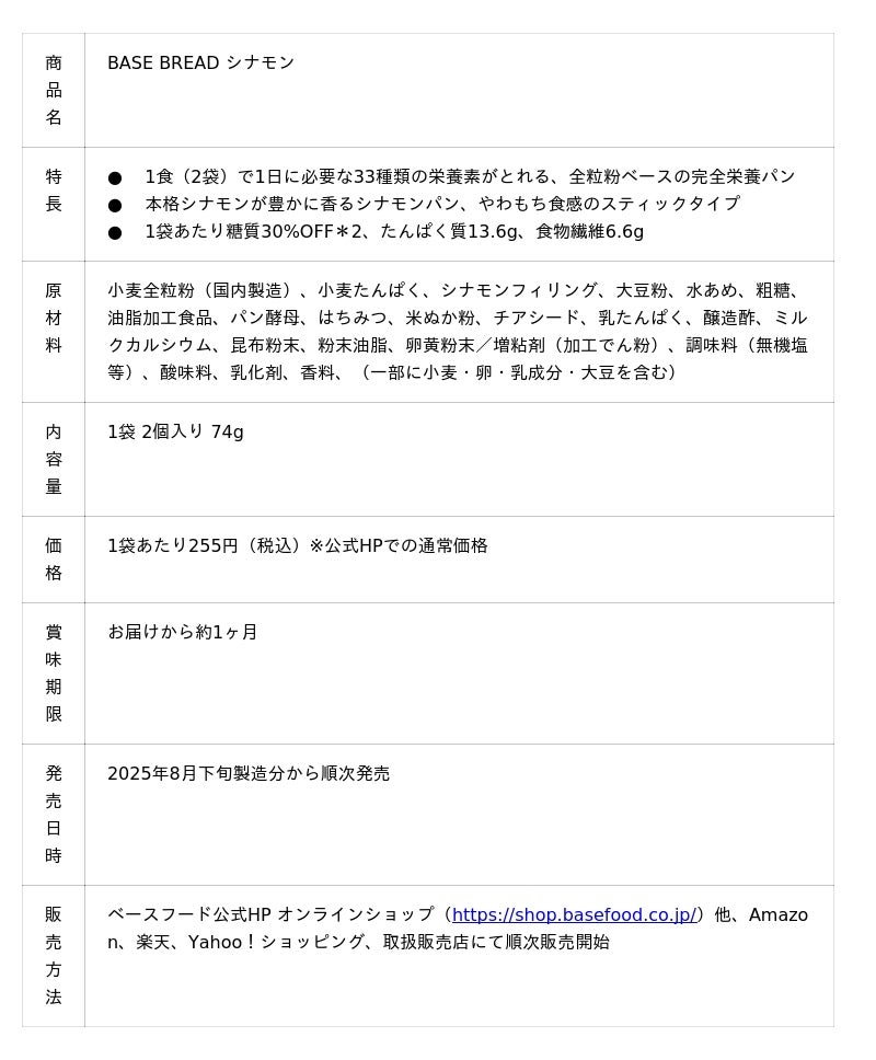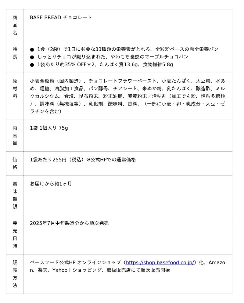 「BASE BREAD チョコレート」「BASE BREAD メープル」「BASE BREAD ミルク」は2025年7月中旬製造分から、「BASE BREAD シナモン」は2025年8月下旬製造分から、それぞれ公式オンラインショップ(https://shop.basefood.co.jp/)、他ECサイト、取扱販売店にて順次販売開始します。